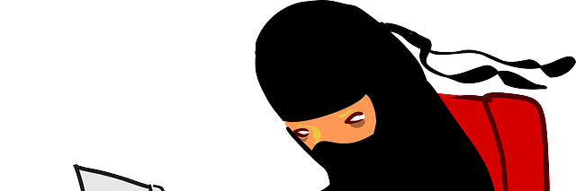 A ninja sitting at a desk, typing away on a laptop.